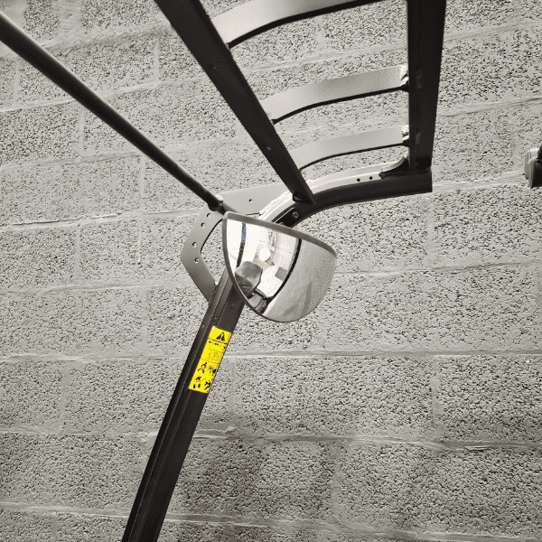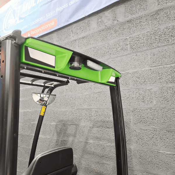 Sécurité intégrée : gyrophare, alarme de recul, rétroviseur, toit de protection, phare avant et arrière.