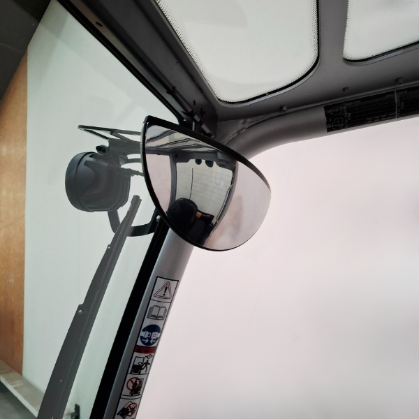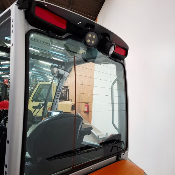Sécurité intégrée : gyrophare, alarme de recul, toit de protection, phare avant et arrière, pare-brise avant et arrière
